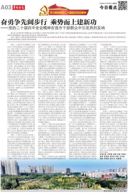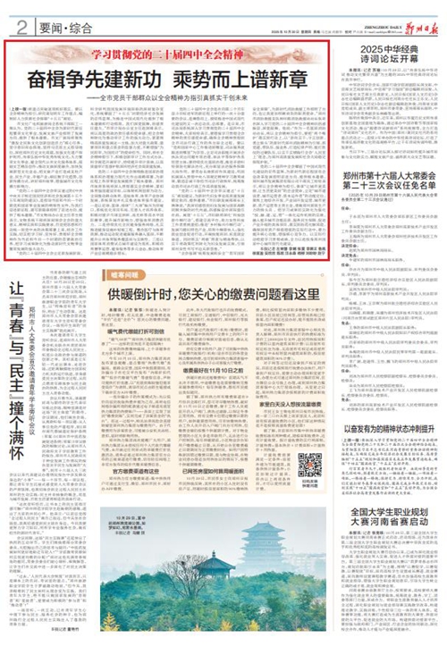 黨的二十屆四中全會擘畫了中國式現(xiàn)代化建設(shè)的宏偉藍圖,為新時代新征程國有企業(yè)改革發(fā)展指明前進方向、提供根本遵循,鄭州城發(fā)集團廣大黨員干部群眾深受鼓舞、倍感振奮。近日,《鄭州日報》《鄭州晚報》開設(shè)了【學習貫徹黨的二十屆四中全會精神】專欄,2025年10月30日,報道了鄭州城發(fā)集團深入學習貫徹落實黨的二十屆四中全會精神,以全會精神為指引真抓實干創(chuàng)未來。